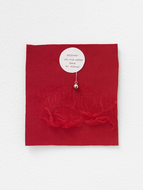 Cinzia Ruggeri, Nessuno dei miei gattini porta gli occhiali, 2018, Felt, collage and cat bell, 25 x 22 cm