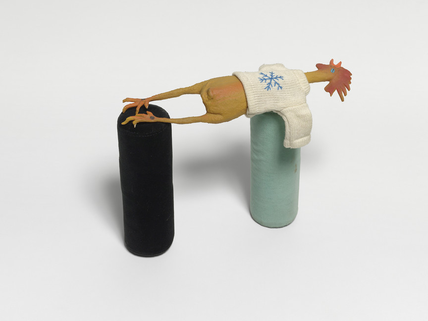 Cinzia Ruggeri, Ipnosi, 2013, velvet poufs, rubber chicken, textile, 34.5 × 40 × 18 cm