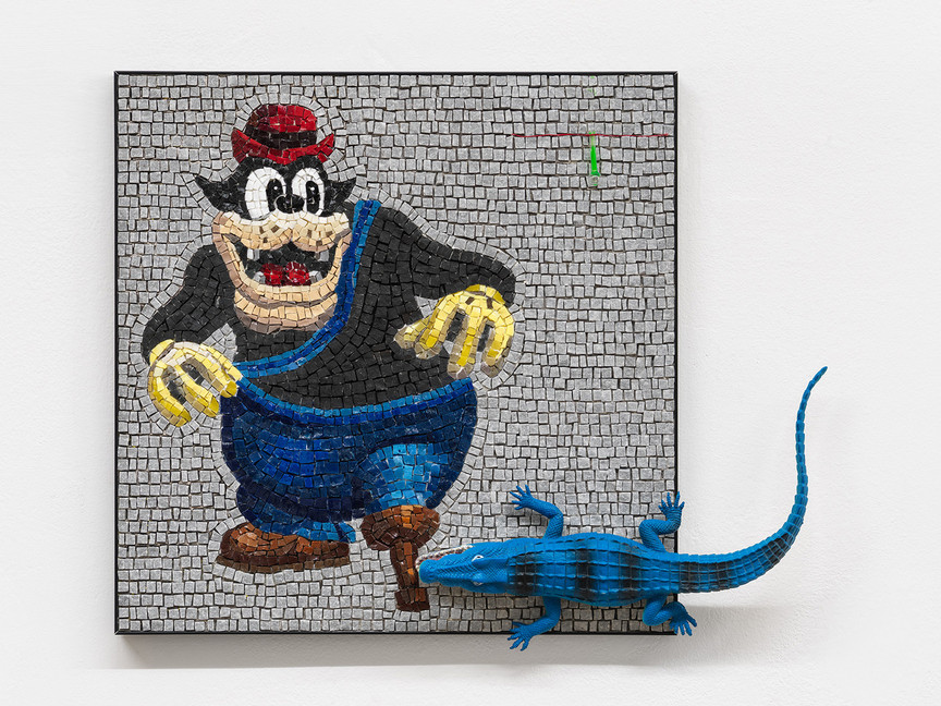 Cinzia Ruggeri, Gamba di legno, 2018, Ravenna mosaic, plastic crocodile, 40 x 50 x 6 cm