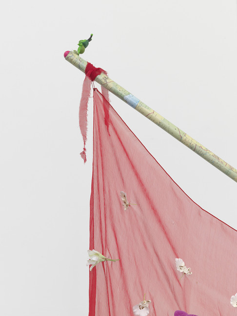 Cinzia Ruggeri, Il bello delle bandiere è il vento (detail), 2018, Hand-embroidered flag, collage on flagpole, 188 x 140 x 7 cm