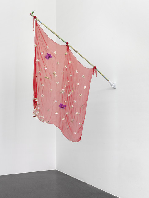 Cinzia Ruggeri, Il bello delle bandiere è il vento, 2018, Hand-embroidered flag, collage on flagpole, 188 x 140 x 7 cm