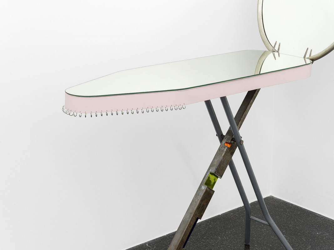 Dozie Kanu, when the context of the current moment falls away (wahala tray), 2024, Steel, Portuguese rose marble, found aluminum bowl, found handlebar grips, 73 x 30 x 60 cm